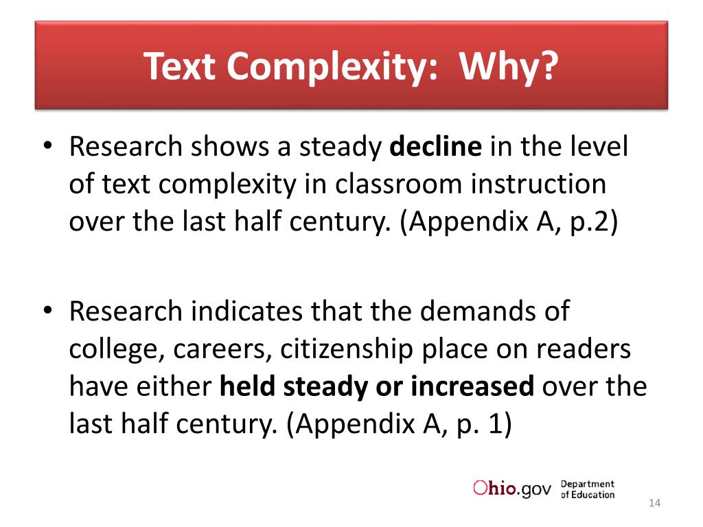 Text Complexity: Why? • Research shows a steady decline in the level of text complexity in classroom instruction over the last half century. (Appendix A, p.2) • Research indicates that the demands of college, careers, citizenship place on readers have either held steady or increased over the last half century. (Appendix A, p. 1)