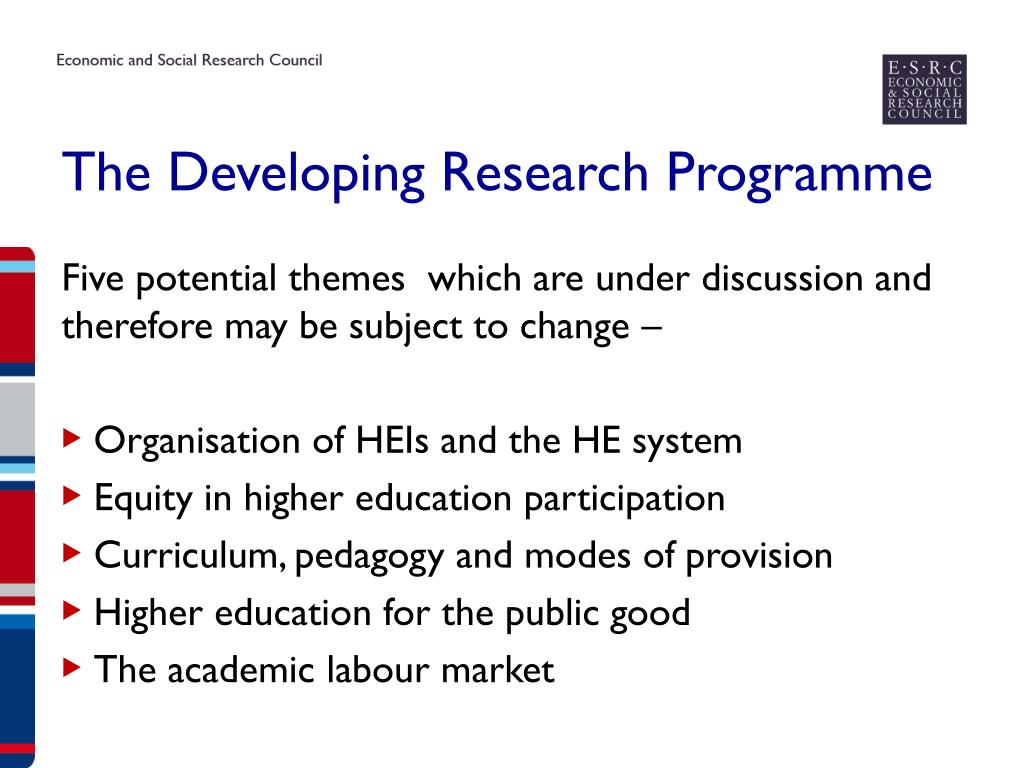 The Developing Research Programme Five potential themes which are under discussion and therefore may be subject to change – • Organisation of HEIs and the HE system • Equity in higher education participation • Curriculum, pedagogy and modes of provision • Higher education for the public good • The academic labour market
