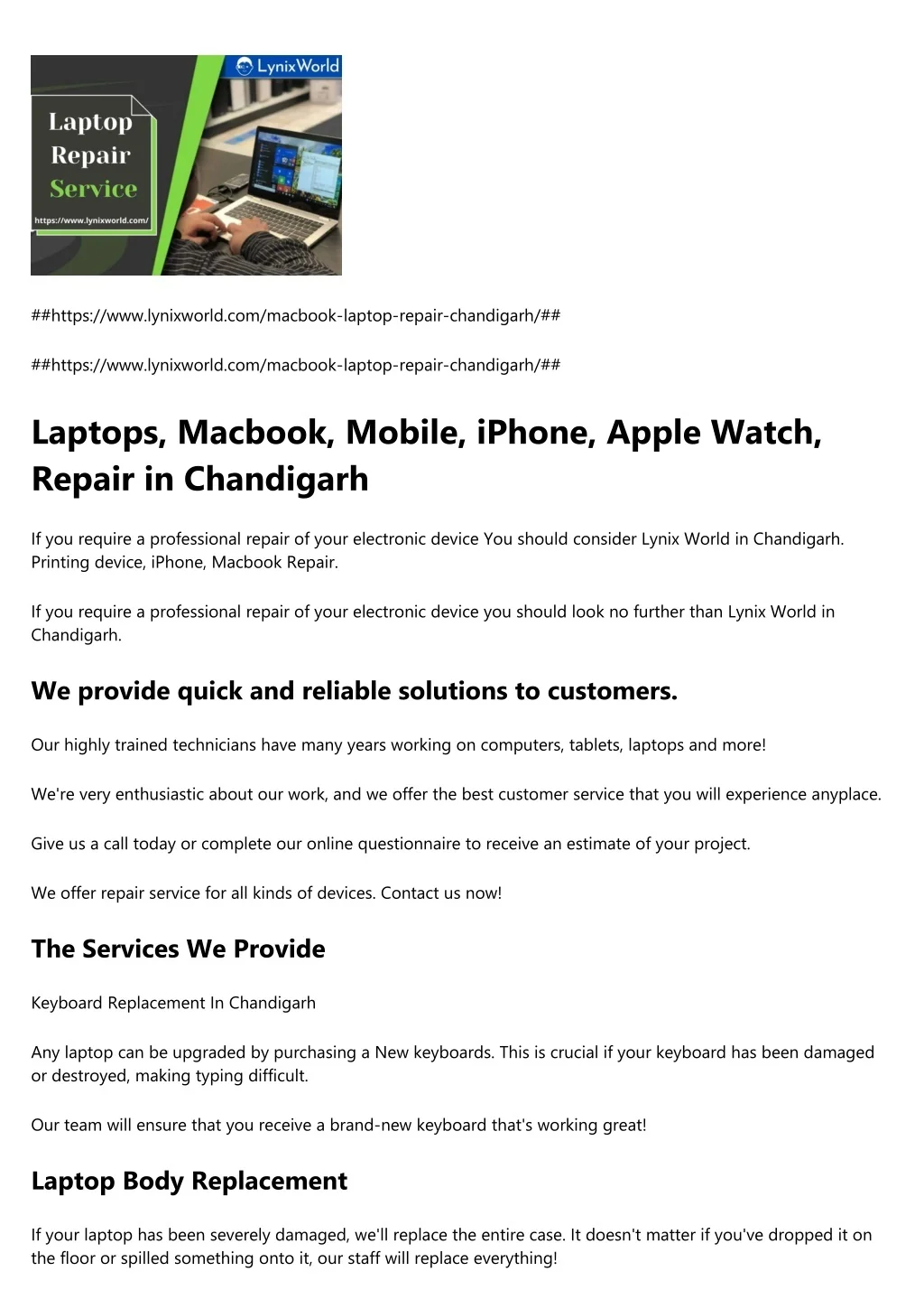 ##https://www.lynixworld.com/macbook-laptop-repair-chandigarh/####https://www.lynixworld.com/macbook-laptop-repair-chandigarh/## ##https://www.lynixworld.com/macbook-laptop-repair-chandigarh/## Laptops, Macbook, Mobile, iPhone, Apple Watch, Repair in Chandigarh If you require a professional repair of your electronic device You should consider Lynix World in Chandigarh. Printing device, iPhone, Macbook Repair. If you require a professional repair of your electronic device you should look no further than Lynix World in Chandigarh. We provide quick and reliable solutions to customers. Our highly trained technicians have many years working on computers, tablets, laptops and more! We're very enthusiastic about our work, and we offer the best customer service that you will experience anyplace. Give us a call today or complete our online questionnaire to receive an estimate of your project. We offer repair service for all kinds of devices. Contact us now! The Services We Provide Keyboard Replacement In Chandigarh Any laptop can be upgraded by purchasing a New keyboards. This is crucial if your keyboard has been damaged or destroyed, making typing difficult. Our team will ensure that you receive a brand-new keyboard that's working great! Laptop Body Replacement If your laptop has been severely damaged, we'll replace the entire case. It doesn't matter if you've dropped it on the floor or spilled something onto it, our staff will replace everything!