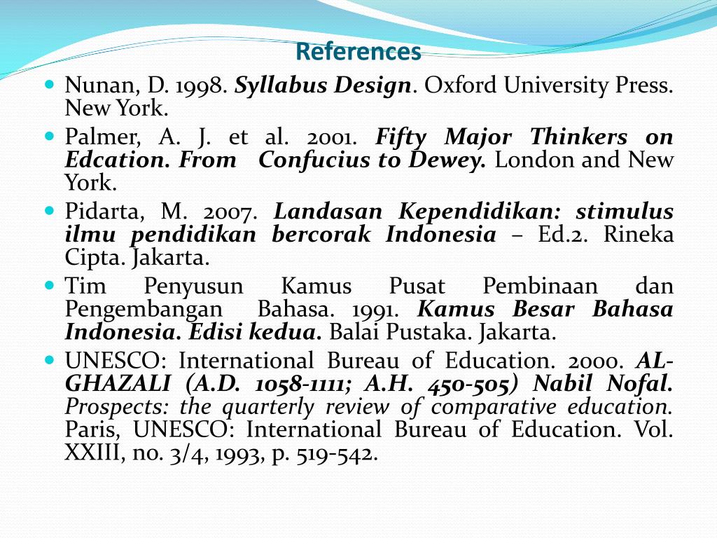 References • Nunan, D. 1998. Syllabus Design. Oxford University Press. New York. • Palmer, A. J. et al. 2001. Fifty Major Thinkers on Edcation. From Confucius to Dewey. London and New York. • Pidarta, M. 2007. LandasanKependidikan: stimulus ilmupendidikanbercorak Indonesia – Ed.2. RinekaCipta. Jakarta. • Tim PenyusunKamusPusatPembinaandanPengembanganBahasa. 1991. KamusBesarBahasa Indonesia. Edisikedua. BalaiPustaka. Jakarta. • UNESCO: International Bureau of Education. 2000. AL-GHAZALI (A.D. 1058-1111; A.H. 450-505) NabilNofal. Prospects: the quarterly review of comparative education. Paris, UNESCO: International Bureau of Education. Vol. XXIII, no. 3/4, 1993, p. 519-542.