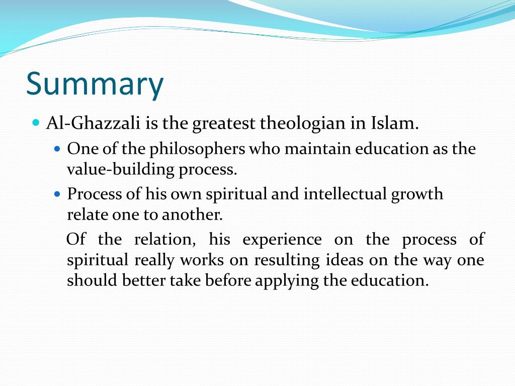 Summary • Al-Ghazzali is the greatest theologian in Islam. • One of the philosophers who maintain education as the value-building process. • Process of his own spiritual and intellectual growth relate one to another. Of the relation, his experience on the process of spiritual really works on resulting ideas on the way one should better take before applying the education.