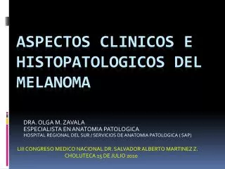 DRA. OLGA M. ZAVALA ESPECIALISTA EN ANATOMIA PATOLOGICA HOSPITAL REGIONAL DEL SUR / SERVICIOS DE ANATOMIA PATOLOGICA ( SAP). ASPECTOS CLINICOS E HISTOPATOLOGICOS DEL MELANOMA . LIII CONGRESO MEDICO NACIONAL DR. SALVADOR ALBERTO MARTINEZ Z.