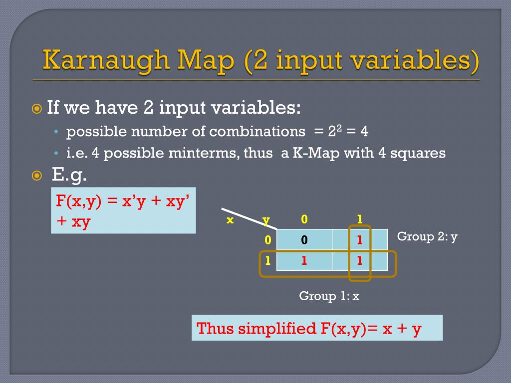 Karnaugh Map (2 input variables) F(x,y) = x’y + xy’ + xy Group 2: y Group 1: x Thus simplified F(x,y)= x + y • If we have 2 input variables: • possible number of combinations = 22 = 4 • i.e. 4 possible minterms, thus a K-Map with 4 squares • E.g.