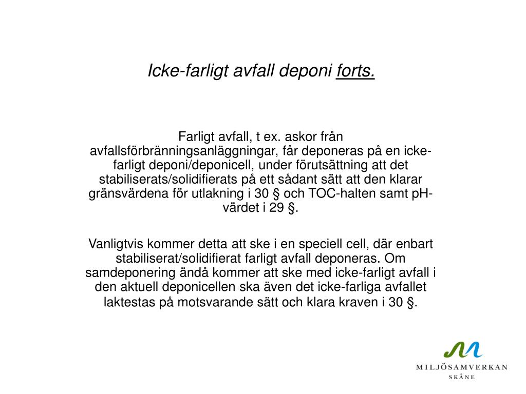 Icke-farligt avfall deponi forts. Farligt avfall, t ex. askor från avfallsförbränningsanläggningar, får deponeras på en icke-farligt deponi/deponicell, under förutsättning att det stabiliserats/solidifierats på ett sådant sätt att den klarar gränsvärdena för utlakning i 30 § och TOC-halten samt pH-värdet i 29 §. Vanligtvis kommer dettaatt ske i en speciell cell, där enbart stabiliserat/solidifierat farligt avfall deponeras. Om samdeponering ändå kommer att ske med icke-farligt avfall i den aktuell deponicellen ska även det icke-farliga avfallet laktestas på motsvarande sätt och klara kraven i 30 §.