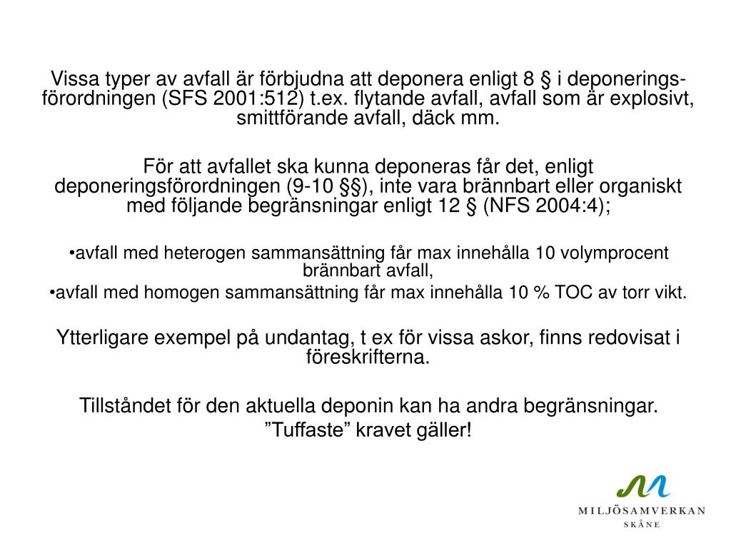 Vissa typer av avfall är förbjudna att deponera enligt 8 § i deponerings-förordningen (SFS 2001:512) t.ex. flytande avfall, avfall som är explosivt, smittförande avfall, däck mm. För att avfallet ska kunna deponeras får det, enligt deponeringsförordningen (9-10 §§), inte vara brännbart eller organiskt med följande begränsningar enligt 12 § (NFS 2004:4); avfall med heterogen sammansättning får max innehålla 10 volymprocent brännbart avfall, avfall med homogen sammansättning får max innehålla 10 % TOC av torr vikt. Ytterligare exempel på undantag, t ex för vissa askor, finns redovisat i föreskrifterna. Tillståndet för den aktuella deponin kan ha andra begränsningar. ”Tuffaste” kravet gäller!