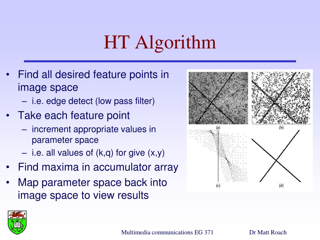 Find all desired feature points in image space i.e. edge detect (low pass filter) Take each feature point increment appropriate values in parameter space i.e. all values of (k,q) for give (x,y) Find maxima in accumulator array Map parameter space back into image space to view results HT Algorithm Multimedia communications EG 371 Dr Matt Roach