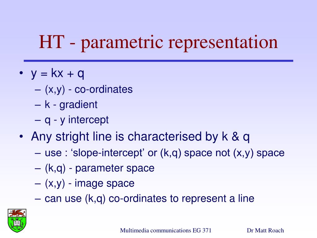 y = kx + q (x,y) - co-ordinates k - gradient q - y intercept Any stright line is characterised by k & q use : ‘slope-intercept’ or (k,q) space not (x,y) space (k,q) - parameter space (x,y) - image space can use (k,q) co-ordinates to represent a line HT - parametric representation Multimedia communications EG 371 Dr Matt Roach