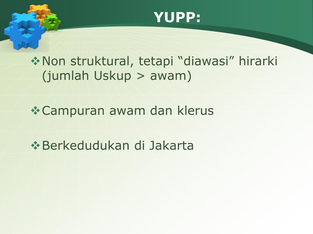 YUPP: • Non struktural, tetapi “diawasi” hirarki (jumlah Uskup > awam) • Campuran awam dan klerus • Berkedudukan di Jakarta