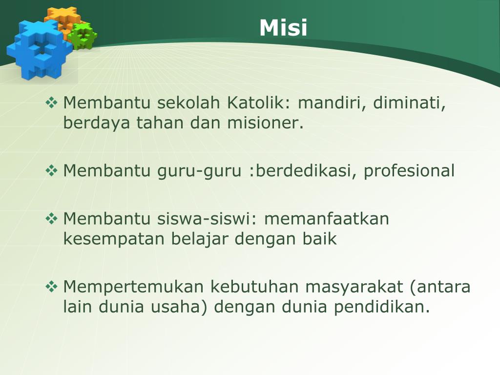 Misi • Membantu sekolah Katolik: mandiri, diminati, berdaya tahan dan misioner. • Membantu guru-guru :berdedikasi, profesional • Membantu siswa-siswi: memanfaatkan kesempatan belajar dengan baik • Mempertemukan kebutuhan masyarakat (antara lain dunia usaha) dengan dunia pendidikan.
