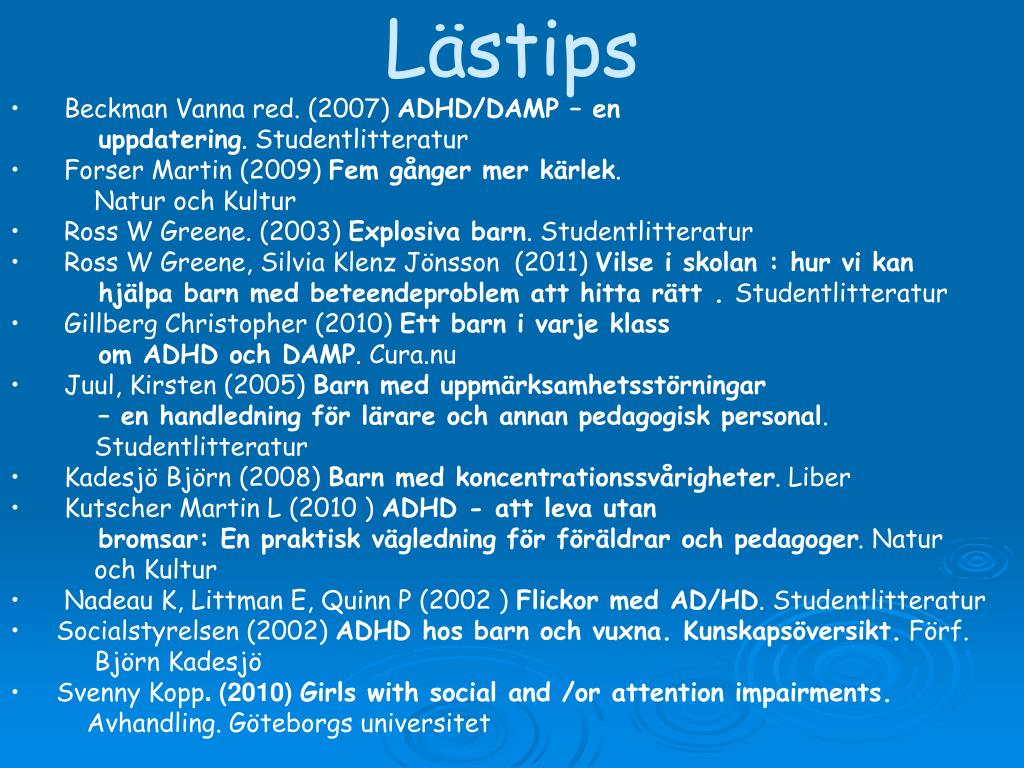 Lästips • Beckman Vanna red. (2007) ADHD/DAMP – en uppdatering. Studentlitteratur • Forser Martin (2009) Fem gånger mer kärlek. Natur och Kultur • Ross W Greene. (2003) Explosiva barn. Studentlitteratur • Ross W Greene, Silvia Klenz Jönsson (2011) Vilse i skolan : hur vi kan hjälpa barn med beteendeproblem att hitta rätt . Studentlitteratur • Gillberg Christopher (2010) Ett barn i varje klass om ADHD och DAMP. Cura.nu • Juul, Kirsten (2005) Barn med uppmärksamhetsstörningar – en handledning för lärare och annan pedagogisk personal. Studentlitteratur • Kadesjö Björn (2008) Barn med koncentrationssvårigheter. Liber • Kutscher Martin L (2010 ) ADHD - att leva utan bromsar: En praktisk vägledning för föräldrar och pedagoger. Natur och Kultur • Nadeau K, Littman E, Quinn P (2002 ) Flickor med AD/HD. Studentlitteratur • Socialstyrelsen (2002) ADHD hos barn och vuxna. Kunskapsöversikt. Förf. Björn Kadesjö • Svenny Kopp. (2010) Girls with social and /or attention impairments. Avhandling. Göteborgs universitet