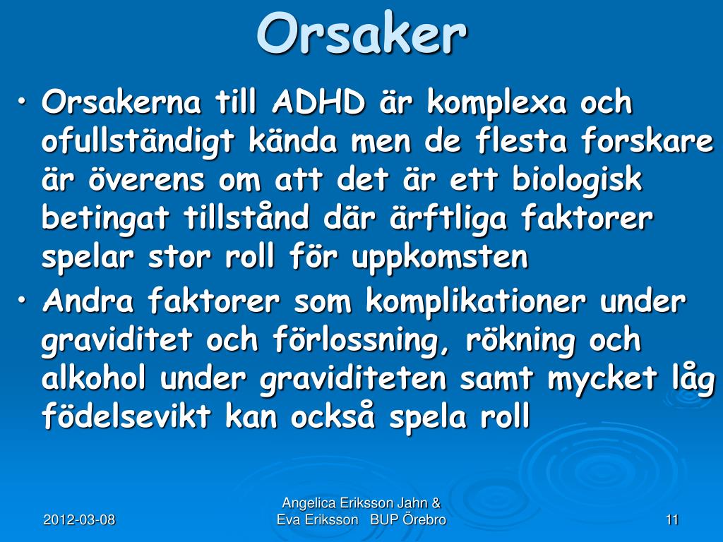 Orsaker • Orsakerna till ADHD är komplexa och ofullständigt kända men de flesta forskare är överens om att det är ett biologisk betingat tillstånd där ärftliga faktorer spelar stor roll för uppkomsten • Andra faktorer som komplikationer under graviditet och förlossning, rökning och alkohol under graviditeten samt mycket låg födelsevikt kan också spela roll Angelica Eriksson Jahn & Eva Eriksson BUP Örebro