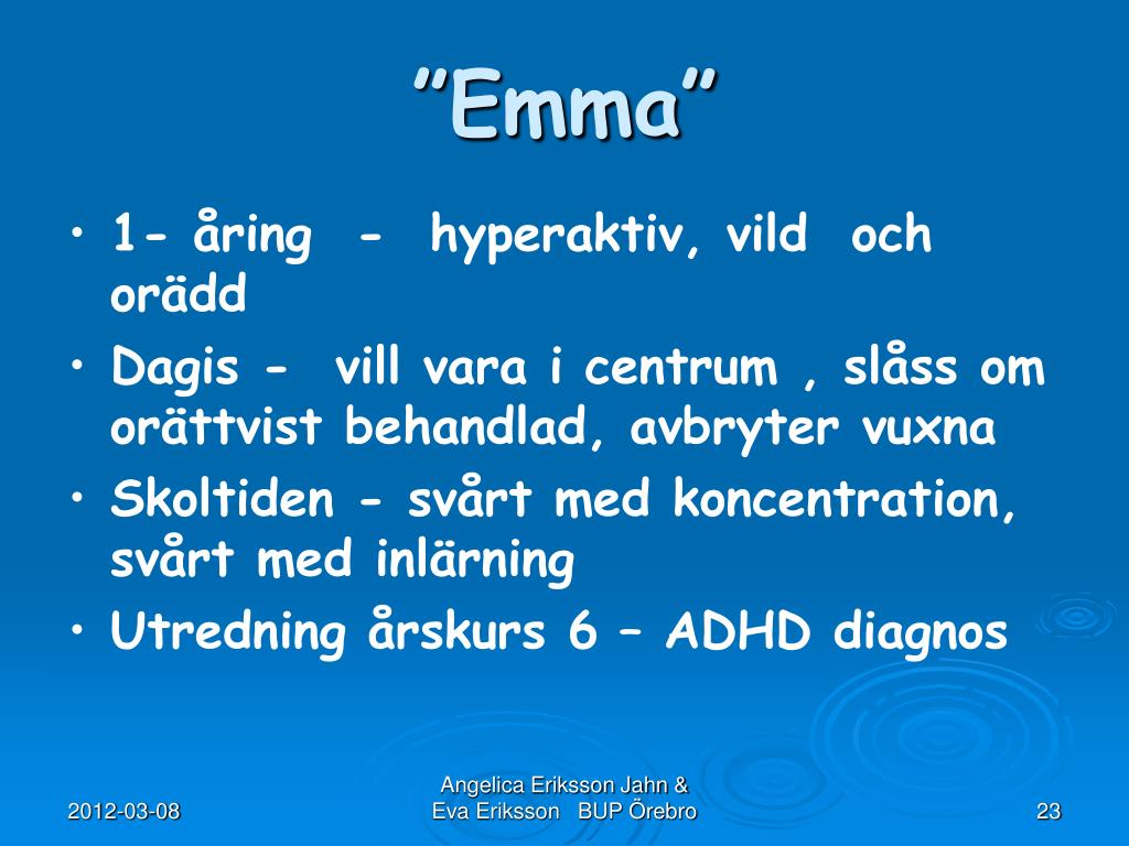 ”Emma” • 1- åring - hyperaktiv, vild och orädd • Dagis - vill vara i centrum , slåss om orättvist behandlad, avbryter vuxna • Skoltiden - svårt med koncentration, svårt med inlärning • Utredning årskurs 6 – ADHD diagnos Angelica Eriksson Jahn & Eva Eriksson BUP Örebro