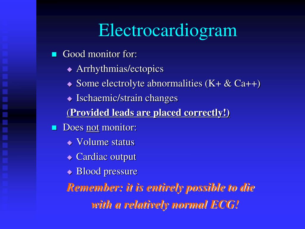 Electrocardiogram • Good monitor for: • Arrhythmias/ectopics • Some electrolyte abnormalities (K+ & Ca++) • Ischaemic/strain changes (Provided leads are placed correctly!) • Does not monitor: • Volume status • Cardiac output • Blood pressure Remember: it is entirely possible to die with a relatively normal ECG!