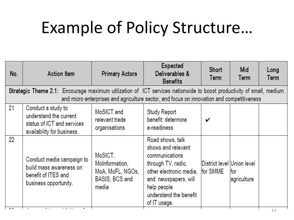 Policy Features • 'National ICT Policy Review Committee' was formed by the Ministry of Science and ICT in 2009 • The policy document is structured as a hierarchical pyramid with a single vision, 10 broad objectives, 56 strategic themes and 306 action items • Action items are categorized into: short term (18 months or less), medium term (5 years or less) or long term (10 years or less).