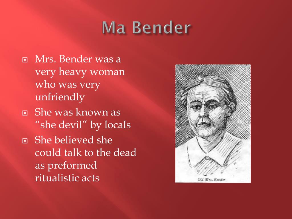 Ma Bender • Mrs. Bender was a very heavy woman who was very unfriendly • She was known as “she devil” by locals • She believed she could talk to the dead as preformed ritualistic acts