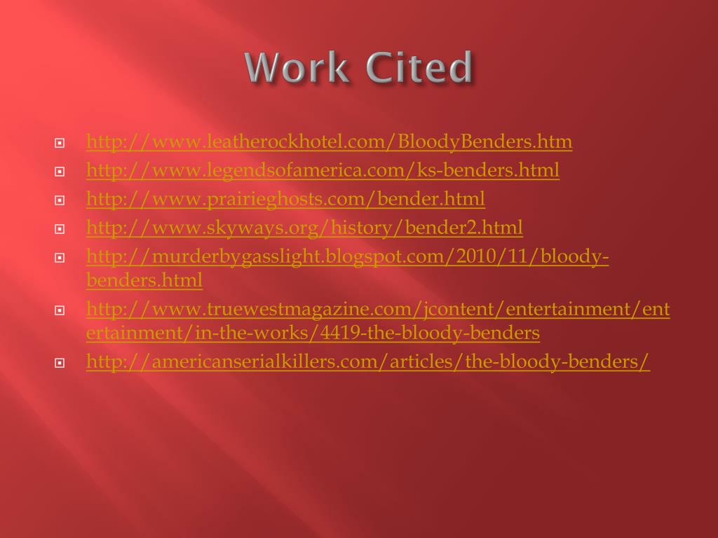 Work Cited • http://www.leatherockhotel.com/BloodyBenders.htm • http://www.legendsofamerica.com/ks-benders.html • http://www.prairieghosts.com/bender.html • http://www.skyways.org/history/bender2.html • http://murderbygasslight.blogspot.com/2010/11/bloody-benders.html • http://www.truewestmagazine.com/jcontent/entertainment/entertainment/in-the-works/4419-the-bloody-benders • http://americanserialkillers.com/articles/the-bloody-benders/