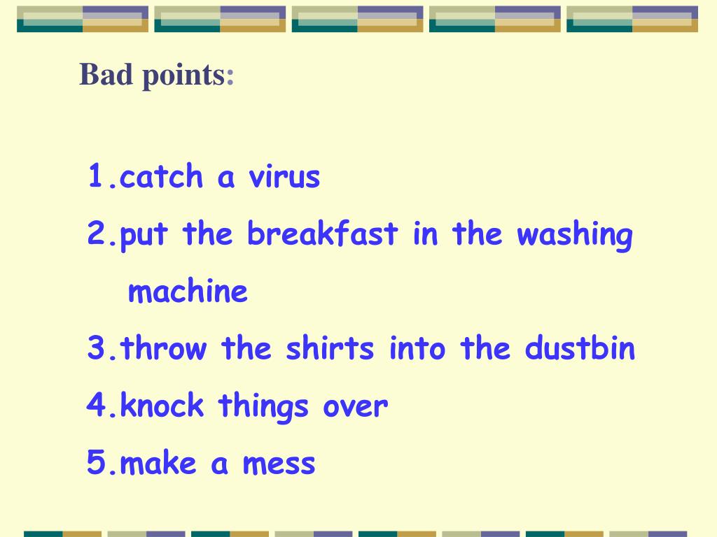 Bad points: • 1.catch a virus • 2.put the breakfast in the washing • machine • 3.throw the shirts into the dustbin • 4.knock things over • 5.make a mess