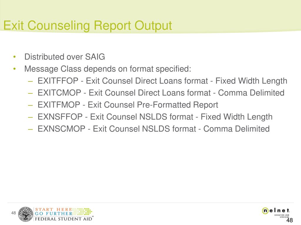 Exit Counseling Report Output • Distributed over SAIG • Message Class depends on format specified: • EXITFFOP - Exit Counsel Direct Loans format - Fixed Width Length • EXITCMOP - Exit Counsel Direct Loans format - Comma Delimited • EXITFMOP - Exit Counsel Pre-Formatted Report • EXNSFFOP - Exit Counsel NSLDS format - Fixed Width Length • EXNSCMOP - Exit Counsel NSLDS format - Comma Delimited 48