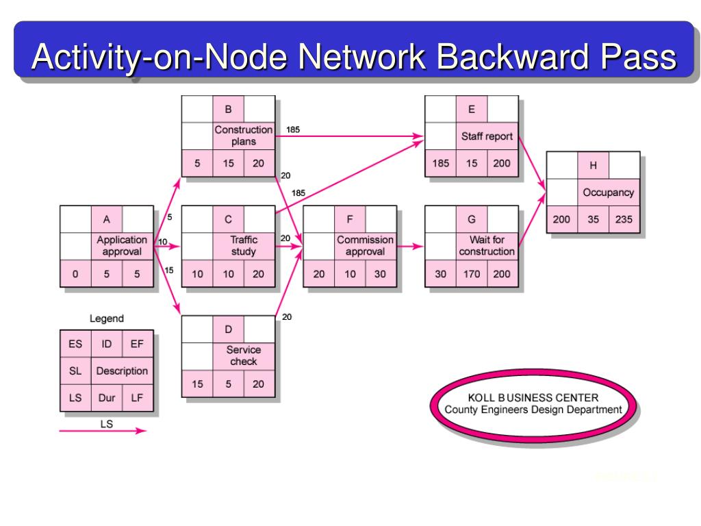 Backward Pass Computation • Subtract activity times along each path in the network (LF - Duration = LS). • Carry the late start (LS) to the next activity where it becomes its late finish (LF) unless • The next succeeding activity is a burst activity, in which case the smallest LF of all preceding activities is selected.