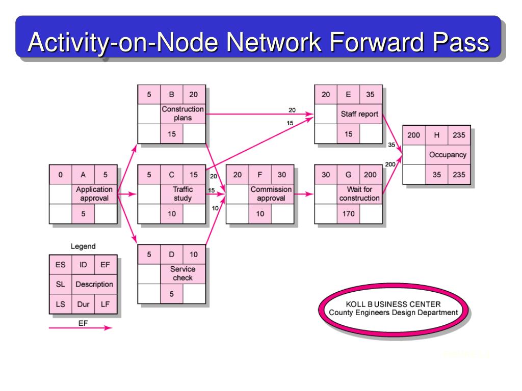 Network Computation Process • Forward Pass—Earliest Times • How soon can the activity start? (early start—ES) • How soon can the activity finish? (early finish—EF) • How soon can the project finish? (expected time—ET) • Backward Pass—Latest Times • How late can the activity start? (late start—LS) • How late can the activity finish? (late finish—LF) • Which activities represent the critical path? • How long can activity be delayed? (slack or float—SL)