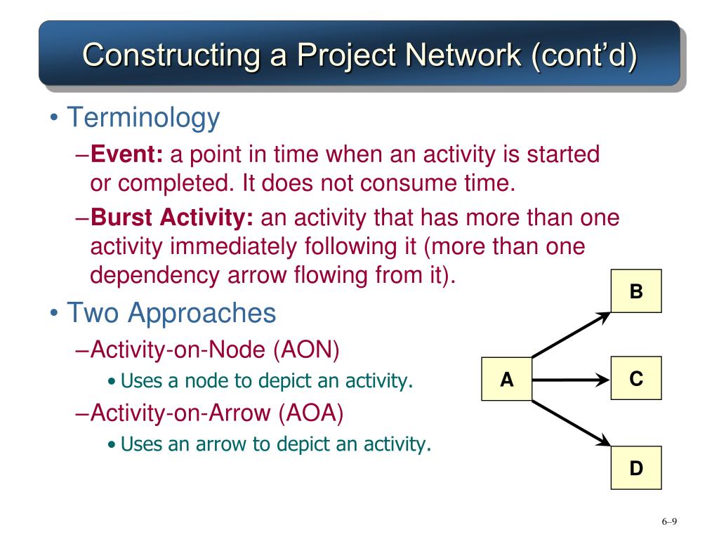 Constructing a Project Network (cont’d) • Terminology • Event: a point in time when an activity is started or completed. It does not consume time. • Burst Activity: an activity that has more than one activity immediately following it (more than one dependency arrow flowing from it). • Two Approaches • Activity-on-Node (AON) • Uses a node to depict an activity. • Activity-on-Arrow (AOA) • Uses an arrow to depict an activity. B C A D