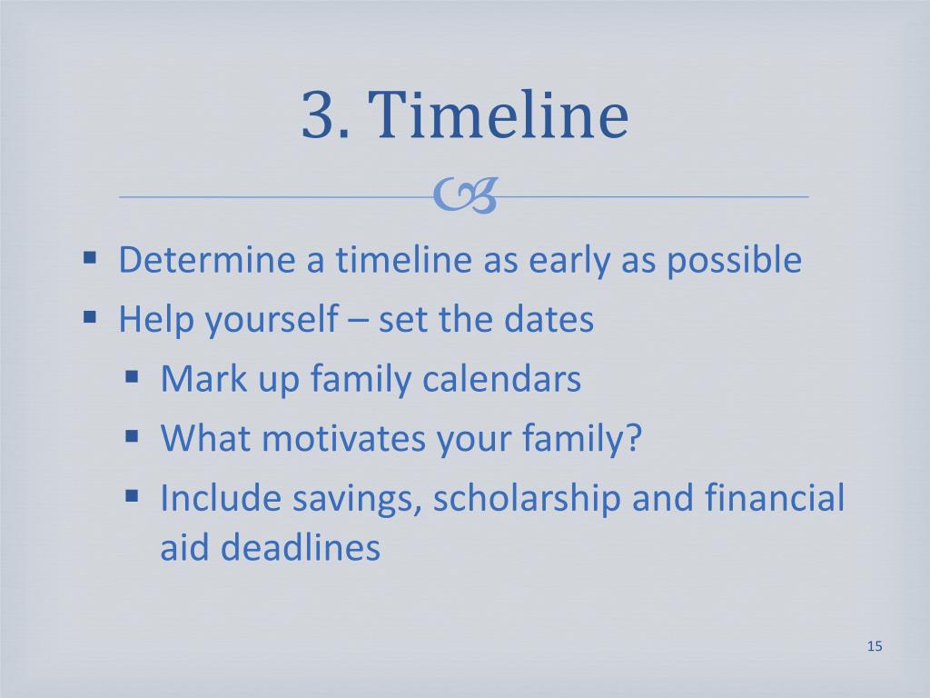 3. Timeline • Determine a timeline as early as possible • Help yourself – set the dates • Mark up family calendars • What motivates your family? • Include savings, scholarship and financial aid deadlines