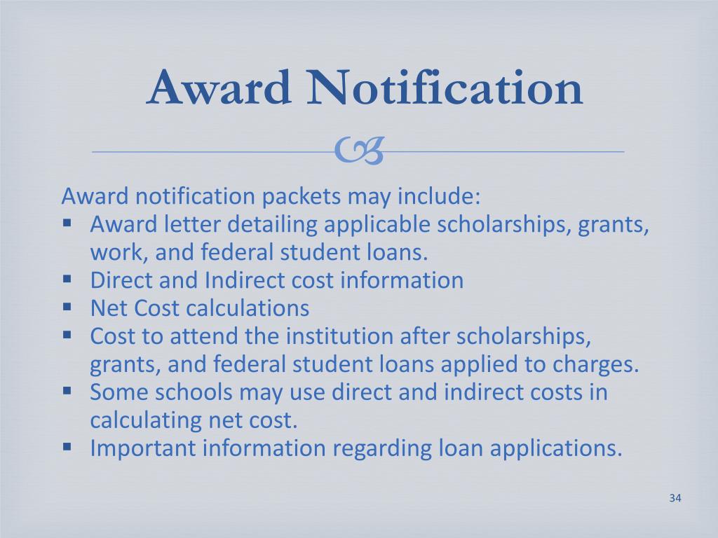 Award Notification Award notification packets may include: • Award letter detailing applicable scholarships, grants, work, and federal student loans. • Direct and Indirect cost information • Net Cost calculations • Cost to attend the institution after scholarships, grants, and federal student loans applied to charges. • Some schools may use direct and indirect costs in calculating net cost. • Important information regarding loan applications.
