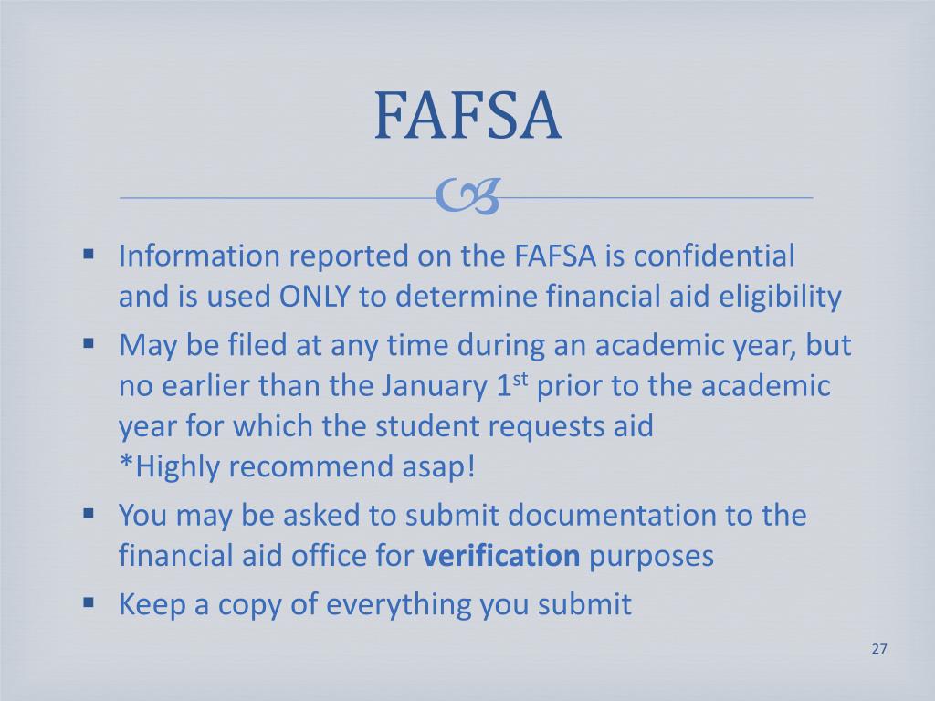 FAFSA • Information reported on the FAFSA is confidential and is used ONLY to determine financial aid eligibility • May be filed at any time during an academic year, but no earlier than the January 1st prior to the academic year for which the student requests aid *Highly recommend asap! • You may be asked to submit documentation to the financial aid office for verification purposes • Keep a copy of everything you submit