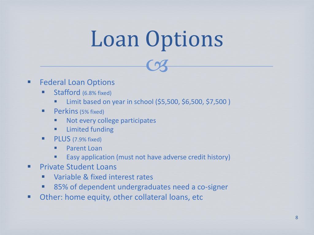 Loan Options • Federal Loan Options • Stafford (6.8% fixed) • Limit based on year in school ($5,500, $6,500, $7,500 ) • Perkins (5% fixed) • Not every college participates • Limited funding • PLUS (7.9% fixed) • Parent Loan • Easy application (must not have adverse credit history) • Private Student Loans • Variable & fixed interest rates • 85% of dependent undergraduates need a co-signer • Other: home equity, other collateral loans, etc