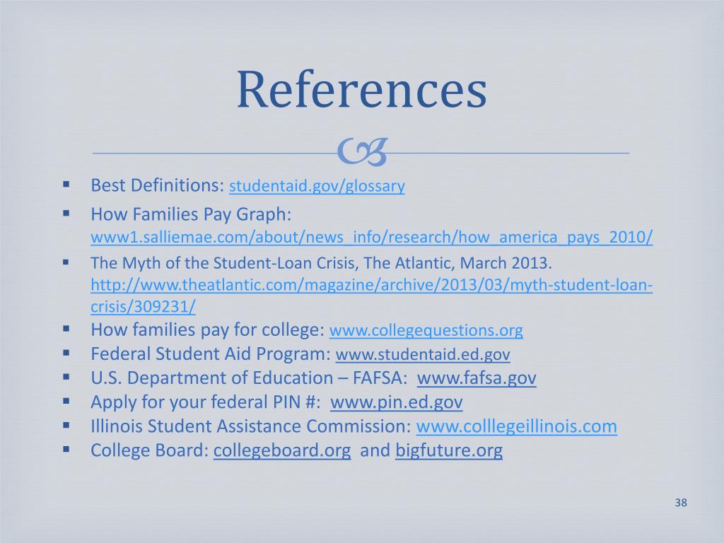 References • Best Definitions: studentaid.gov/glossary • How Families Pay Graph: www1.salliemae.com/about/news_info/research/how_america_pays_2010/ • The Myth of the Student-Loan Crisis, The Atlantic, March 2013.http://www.theatlantic.com/magazine/archive/2013/03/myth-student-loan-crisis/309231/ • How families pay for college: www.collegequestions.org • Federal Student Aid Program: www.studentaid.ed.gov • U.S. Department of Education – FAFSA: www.fafsa.gov • Apply for your federal PIN #: www.pin.ed.gov • Illinois Student Assistance Commission: www.colllegeillinois.com • College Board: collegeboard.org and bigfuture.org