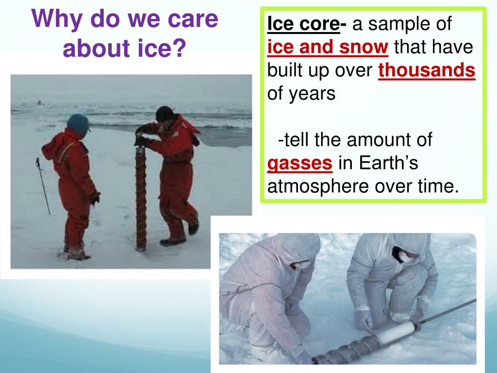 Why do we care about ice? Ice core- a sample of ice and snowthat have built up over thousands of years -tell the amount of gassesin Earth’s atmosphere over time.