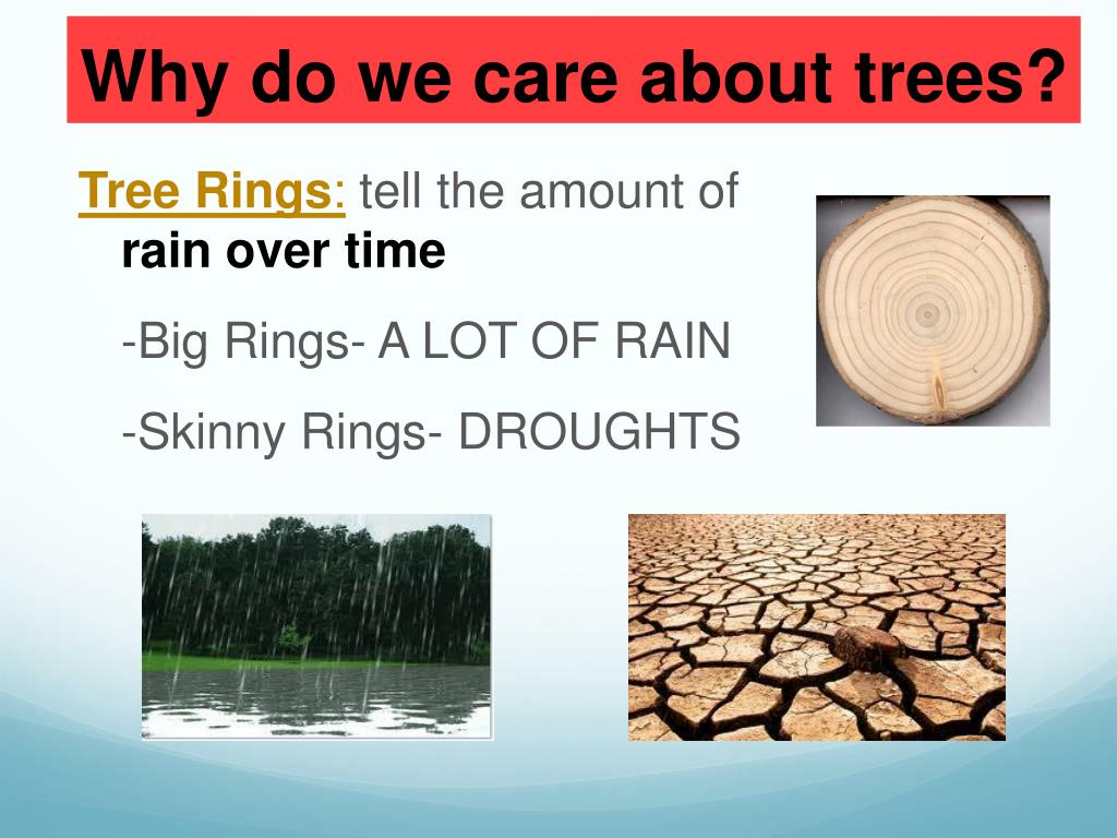 Why do we care about trees? Tree Rings:tell the amount of rain over time -Big Rings- A LOT OF RAIN -Skinny Rings- DROUGHTS