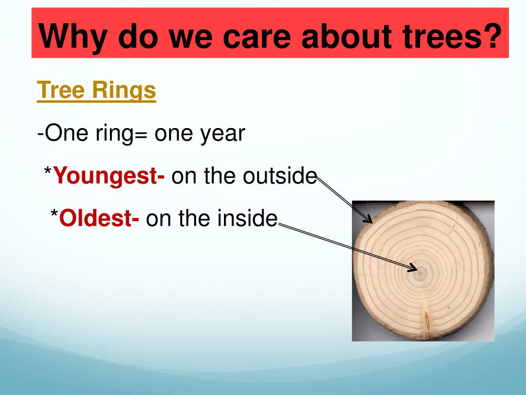 Why do we care about trees? Tree Rings -One ring= one year *Youngest- on the outside *Oldest- on the inside