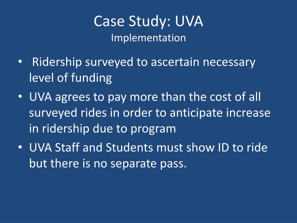 Case Study: UVAImplementation • Ridership surveyed to ascertain necessary level of funding • UVA agrees to pay more than the cost of all surveyed rides in order to anticipate increase in ridership due to program • UVA Staff and Students must show ID to ride but there is no separate pass.