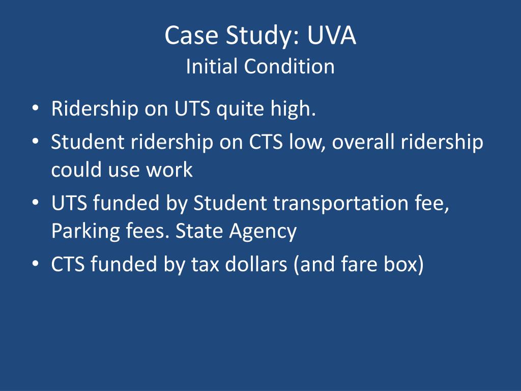 Case Study: UVAInitial Condition • Ridership on UTS quite high. • Student ridership on CTS low, overall ridership could use work • UTS funded by Student transportation fee, Parking fees. State Agency • CTS funded by tax dollars (and fare box)