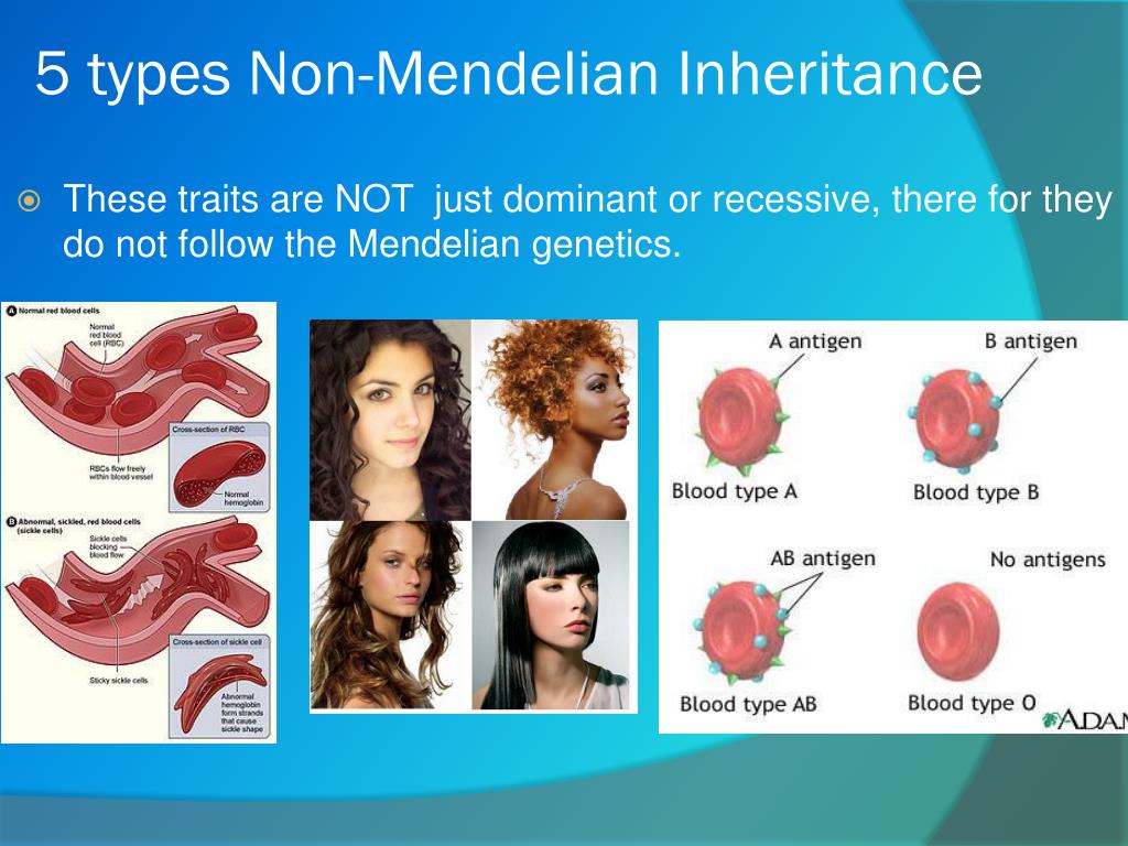 5 types Non-Mendelian Inheritance • These traits are NOT just dominant or recessive, there for they do not follow the Mendelian genetics.