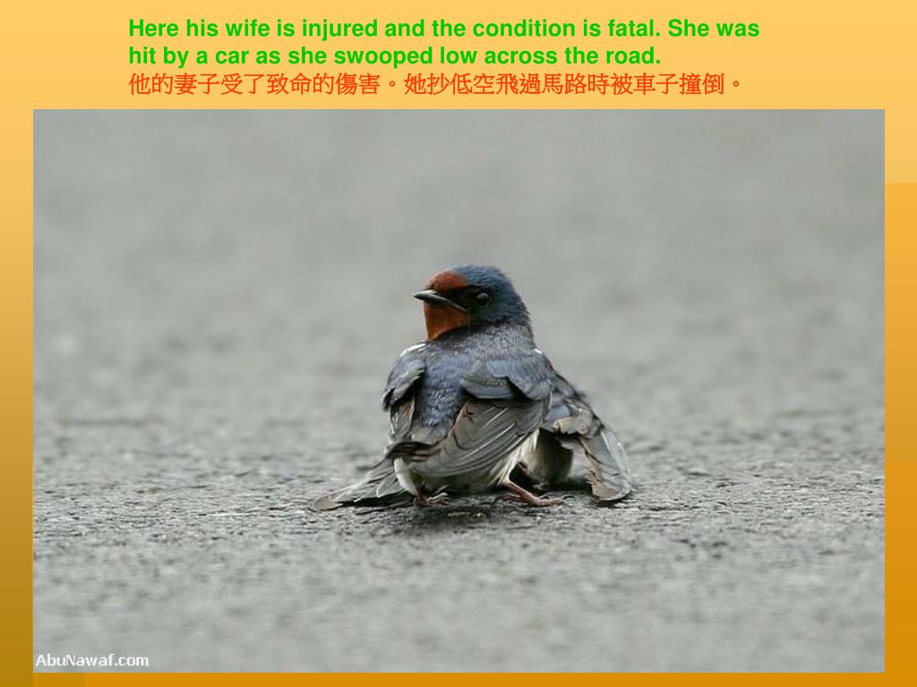 感人的燕子 Heart-Stirring Swallows. 按滑鼠換頁 Click for page continue. Please leave Show intact. Here his wife is injured and the condition is fatal. She was hit by a car as she swooped low across the road. 他的妻子受了致命的傷害。她抄低空飛過馬路時被車子撞倒。.