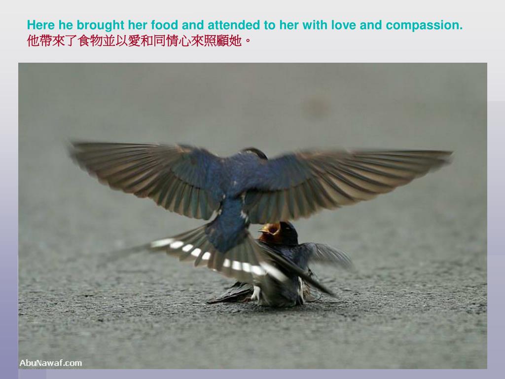 Here he brought her food and attended to her with love and compassion. 他帶來了食物並以愛和同情心來照顧她。