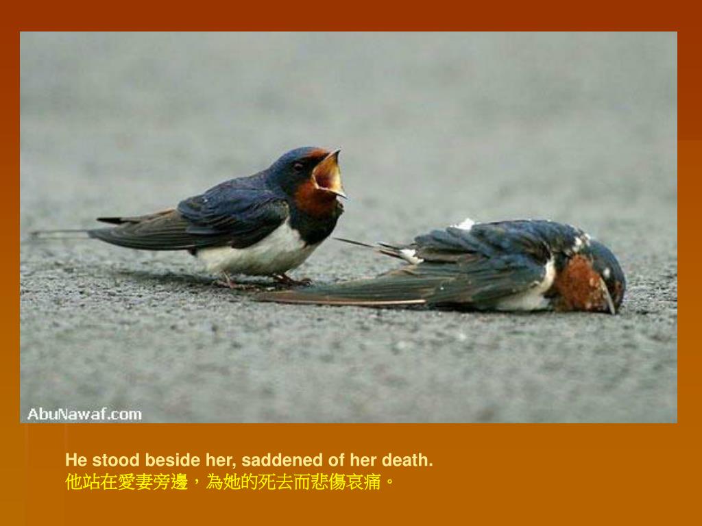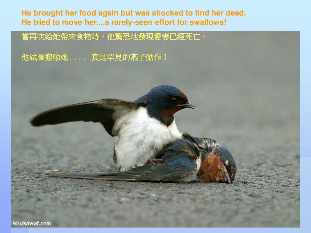 He brought her food again but was shocked to find her dead. He tried to move her....a rarely-seen effort for swallows! 當再次給她帶來食物時,他驚恐地發現愛妻已經死亡。他試圖搬動她.... 真是罕見的燕子動作!