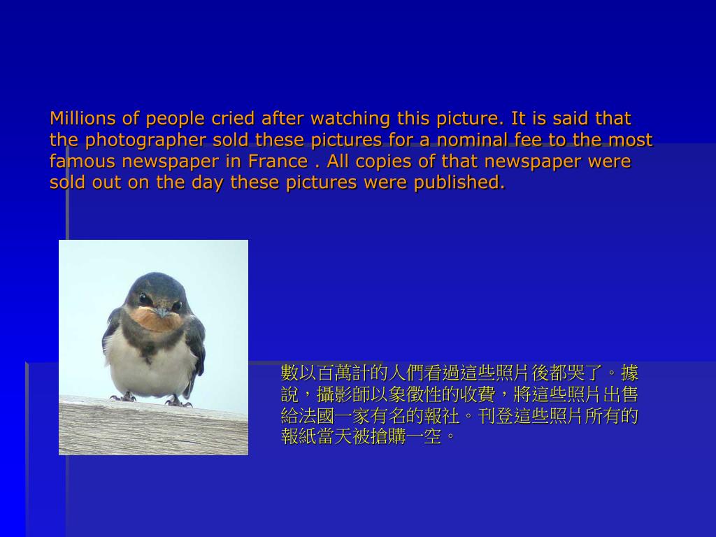 Millions of people cried after watching this picture. It is said that the photographer sold these pictures for a nominal fee to the most famous newspaper in France . All copies of that newspaper were sold out on the day these pictures were published. 數以百萬計的人們看過這些照片後都哭了。據說,攝影師以象徵性的收費,將這些照片出售給法國一家有名的報社。刊登這些照片所有的報紙當天被搶購一空。