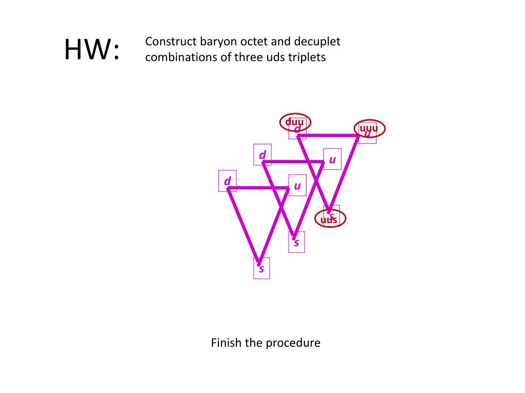 HW: Construct baryon octet and decuplet combinations of three uds triplets duu d uuu u d u d u s uus s s Finish the procedure