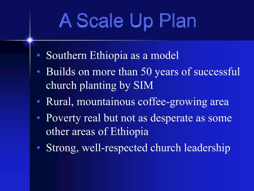 A Scale Up Plan • Southern Ethiopia as a model • Builds on more than 50 years of successful church planting by SIM • Rural, mountainous coffee-growing area • Poverty real but not as desperate as some other areas of Ethiopia • Strong, well-respected church leadership