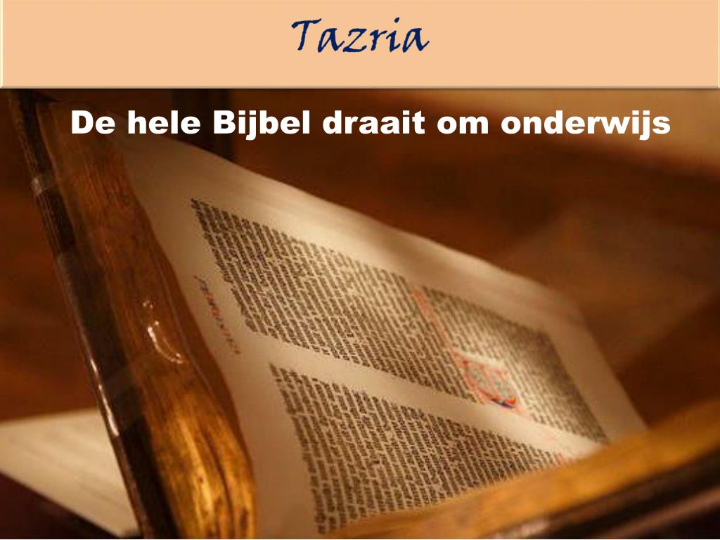 TORAH • JARA – onderwijzen • Deze woorden die Ik je opdraag • zullen in je hart zijn. • Je scherpt deze woorden je kinderen in • en je spreekt erover, • wanneer je in je huis zit, • wanneer je onderweg bent, • wanneer je gaat liggen en wanneer je opstaat. Je knoopt ze tot een teken op je hand, • Ze zijn tot een teken tussen je ogen, • en je schrijft ze op de deurposten • van je huis en in je poorten.” • [Deut.6:7-9] Tazria