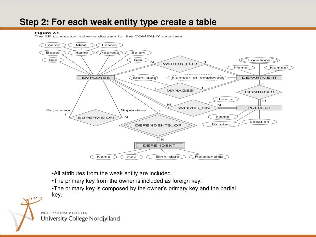Step 2: For each weak entity type create a table All attributes from the weak entity are included. The primary key from the owner is included as foreign key. The primary key is composed by the owner’s primary key and the partial key.