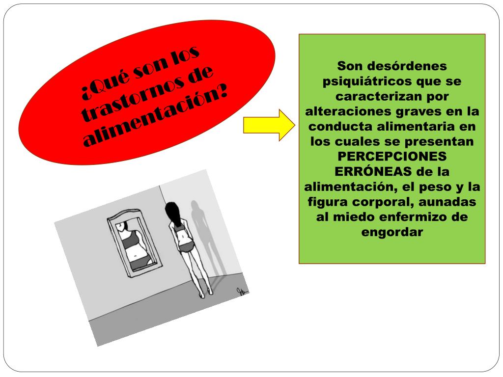 ¿Qué son los trastornos de alimentación? Son desórdenes psiquiátricos que se caracterizan por alteraciones graves en la conducta alimentaria en los cuales se presentan PERCEPCIONES ERRÓNEAS de la alimentación, el peso y la figura corporal, aunadas al miedo enfermizo de engordar