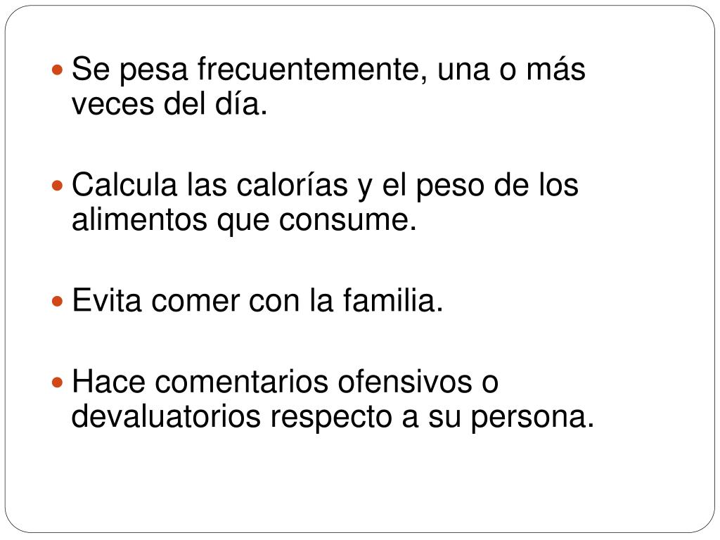 Se pesa frecuentemente, una o más veces del día. • Calcula las calorías y el peso de los alimentos que consume. • Evita comer con la familia. • Hace comentarios ofensivos o devaluatorios respecto a su persona.