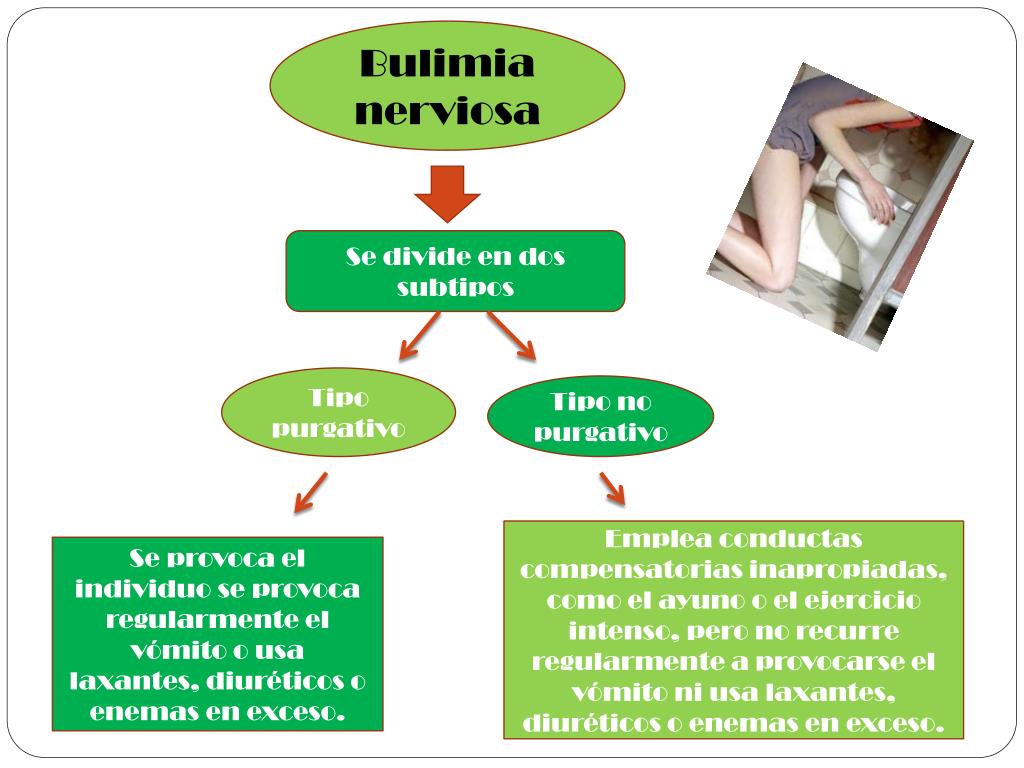 Bulimia nerviosa Se divide en dos subtipos Tipo purgativo Tipo no purgativo Emplea conductas compensatorias inapropiadas, como el ayuno o el ejercicio intenso, pero no recurre regularmente a provocarse el vómito ni usa laxantes, diuréticos o enemas en exceso. Se provoca el individuo se provoca regularmente el vómito o usa laxantes, diuréticos o enemas en exceso.