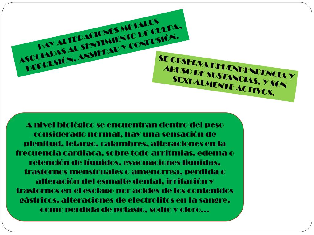 HAY ALTERACIONES METALES ASOCIADAS AL SENTIMIENTO DE CULPA, DEPRESIÓN, ANSIEDAD Y CONFUSIÓN. SE OBSERVA DEPENDENDENCIA Y ABUSO DE SUSTANCIAS, Y SON SEXUALMENTE ACTIVOS. A nivel biológico se encuentran dentro del peso considerado normal, hay una sensación de plenitud, letargo, calambres, alteraciones en la frecuencia cardiaca, sobre todo arritmias, edema o retención de líquidos, evacuaciones liquidas, trastornos menstruales o amenorrea, perdida o alteración del esmalte dental, irritación y trastornos en el esófago por acides de los contenidos gástricos, alteraciones de electrolitos en la sangre, como perdida de potasio, sodio y cloro…