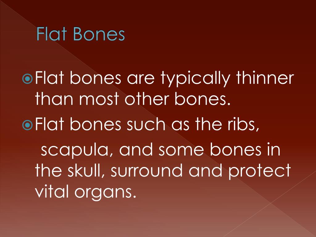 Flat Bones • Flat bones are typically thinner than most other bones. • Flat bones such as the ribs, scapula, and some bones in the skull, surround and protect vital organs.