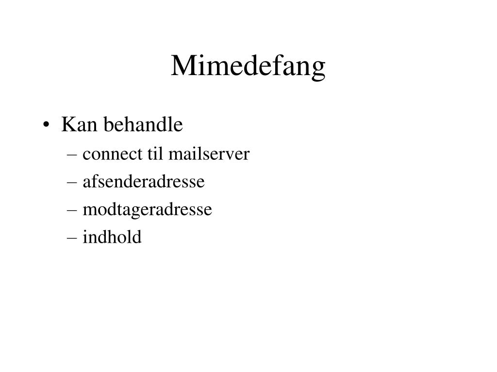 Mimedefang • Kan behandle • connect til mailserver • afsenderadresse • modtageradresse • indhold